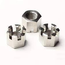 Es una tuerca hexagonal con ranuras en cada una de sus caras recargados a uno de sus bordes.